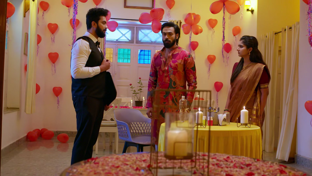 ఇంతలో కావ్య దాహం వేస్తుందని చెప్పడంతో రాజ్ వాటర్ బాటిల్ తీసుకురమ్మని బేరర్ని పిలుస్తాడు. వారి ముందు వచ్చిన బేరర్ను చూసి ఇద్దరూ ఒక్కసారిగా షాక్ అవుతారు — ఎందుకంటే అది రాహుల్.
