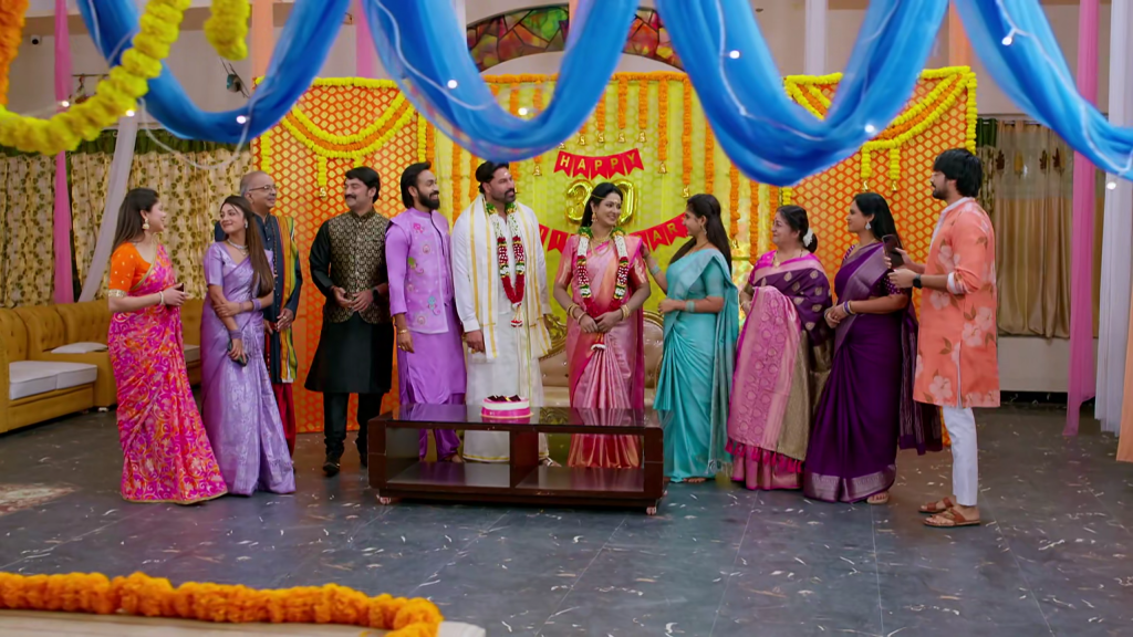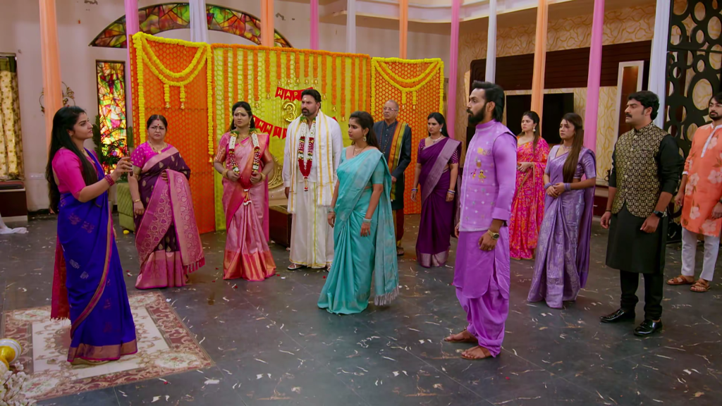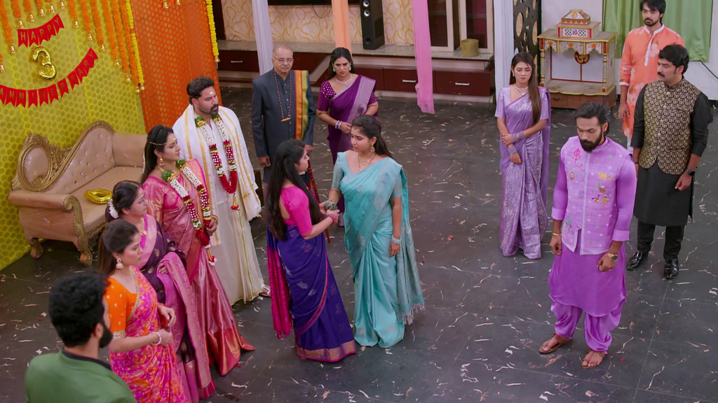 ఇక ఇంట్లో మాత్రం అపర్ణ-సుభాష్ పెళ్లి రోజు వేడుకలో అందరూ డ్యాన్స్ చేస్తూ, నవ్వుతూ, ఆనందంగా ఉంటారు. మ్యూజిక్, డ్యాన్స్, ఫ్యామిలీ అంతా కలిసిమెలిసి ఉన్న ఆ వాతావరణంలో స్వప్న కోపంగా వచ్చి రాజ్ను పిలుస్తుంది. ఎవ్వరూ పట్టించుకోకపోవడంతో సమీపంలో ఉన్న ఫ్లవర్ వాజ్ని పట్టుకుని నేల మీదకి విసిరి కొడుతుంది. ఆ శబ్దం వినగానే అందరూ షాక్ అవుతారు. ఇందిరాదేవి “దీనికేదో దెయ్యం పట్టింది అనుకుంట. నిన్న నుండి ఇలానే తేడాగా ప్రవర్తిస్తుంది” అని అంటుంది. కానీ స్వప్న మాత్రం గట్టిగానే, “నాకు దెయ్యం పట్టలేదు… మీ మనవడు ఏం చేశాడో తెలిస్తే మీకే పిచ్చి పడుతుంది,” అని చెబుతుంది.