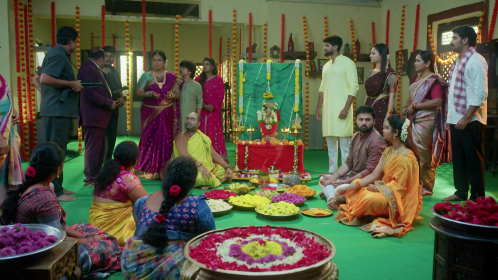 పూజ సమయంలో లోహిత కొబ్బరికాయ కొడుతుంది. ఆ కొబ్బరి చిప్ప నేలపై పడగానే ఆర్టిస్టులు ఇద్దరూ దానికోసం “నాది” – “నాదే” అంటూ తగువులాడుతారు. అందరూ బిత్తరపోతారు. వెంటనే వాళ్లు కవర్ చేస్తూ, “కొబ్బరి చిప్ప నేల మీద పడకూడదు కాబట్టి తీసుకున్నాం” అని అంటారు.