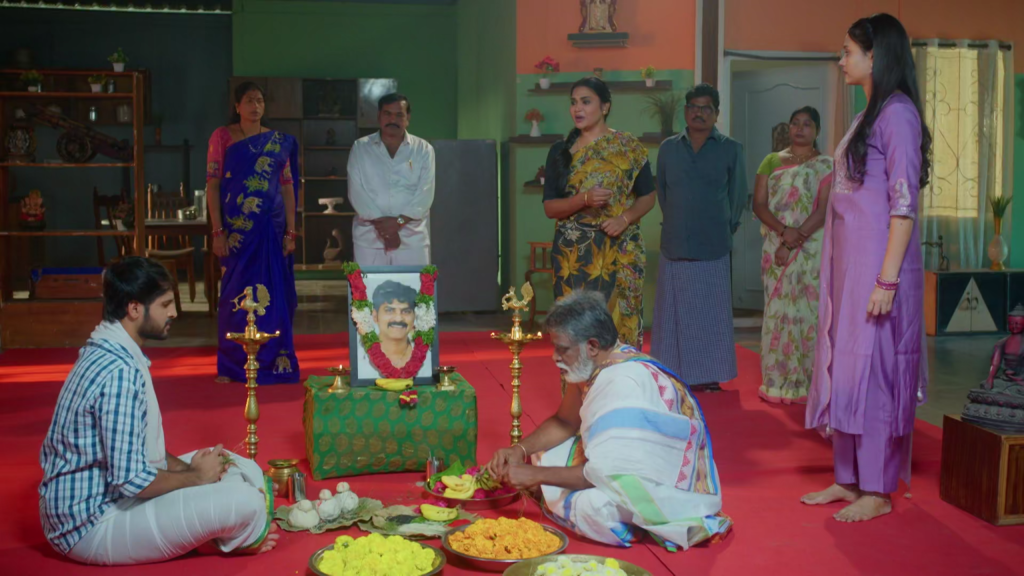 సత్యంబాబు ఆబ్దికం కోసం పంతులుతో అన్ని ఏర్పాట్లు చేయిస్తారు చందు, సరళ. చందు తన తండ్రి ఫోటో చూస్తూ చిన్ననాటి జ్ఞాపకాల్లోకి వెళ్లిపోతాడు. సరళ లోహిత కోసం ఎదురు చూస్తూ “చందు ఒకసారి లోహితకి ఫోన్ చేయరా” అని అడుగుతుంది. కానీ చందు కోపంగా “రాత్రి చెప్పావుగా చాలు బొట్టు పెట్టి పిలిచే పని లేదు. నాన్న మీద ప్రేమ ఉన్న వాళ్ళని నాన్నే రప్పిస్తాడు” అని అంటాడు. కానీ సరళ “ఒక 10 నిమిషాలు ఆగుదాం రా ” అని చెబుతుంది.చందు కోపంగా చూస్తాడు కానీ సరళ ఆగమని పంతులుతో అంటుంది.