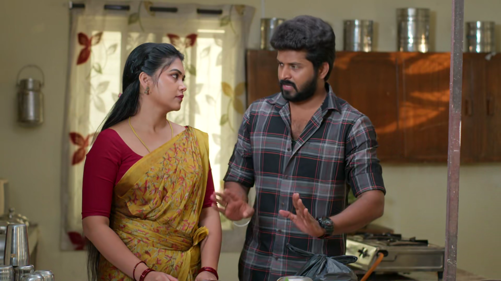 ప్రభావతి బీరువా తలుపు తెరిచి లోపల ఉన్న బంగారాన్ని తీసుకుంటుంది. ఆ సమయంలో సత్యం అక్కడికి వచ్చి ఆమెను ఆపుతాడు. అతను “నీ చేతిలో ఉన్నది ఏమిటి?” అని అడుగుతాడు. ప్రభావతి భయంతో “ఇది నా బ్లౌజ్ ముక్క, కుట్టించుకోవడానికి మనోజ్కి ఇవ్వాలనుకున్నాను” అని చెబుతుంది. సత్యం కొంత అనుమానంగా ఉన్నా ఆమె మాటలు విని “సరే, వెళ్ళు” అని అనుమతిస్తాడు. ప్రభావతి కవర్ చేతిలో పట్టుకుని బయటికి వెళ్తుంది.