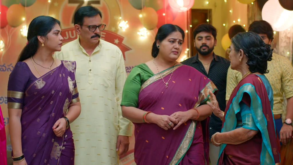 ఇంతలో శ్రుతి తల్లి ఇంట్లోకి వస్తుంది. అందరి ఆనందం చూసి బయటకి నవ్వుతున్నా, లోపల మాత్రం అసహనం పెరుగుతుంది. “ఇంత సంతోషంగా ఉన్న ఈ ఇంట్లో ఏదో ఒక గొడవ చేయాలి” అని మనసులో అనుకుంటుంది. వెంటనే “హ్యాపీ బర్త్డే” అంటూ సుశీలమ్మను అభినందిస్తుంది. “మాలాంటి వాళ్ల ఇళ్లలోనే పెద్దవాళ్ల వేడుకలు చేస్తాం అనుకున్నా, మీరు కూడా బాగానే చేస్తున్నారు” అని చెబుతుంది. సత్యం బదులిస్తూ “వేడుకలు అంటే అందరిని పిలిచి చేసుకునేది ఏముంటుంది అయినా వాళ్ళతో సంతోషంగా గడిపితే సరిపోతుంది కదా” అని అంటాడు. “అవును ఖర్చు లేని పని కదా ” అని శృతి తల్లి వ్యంగ్యంగా అంటుంది.