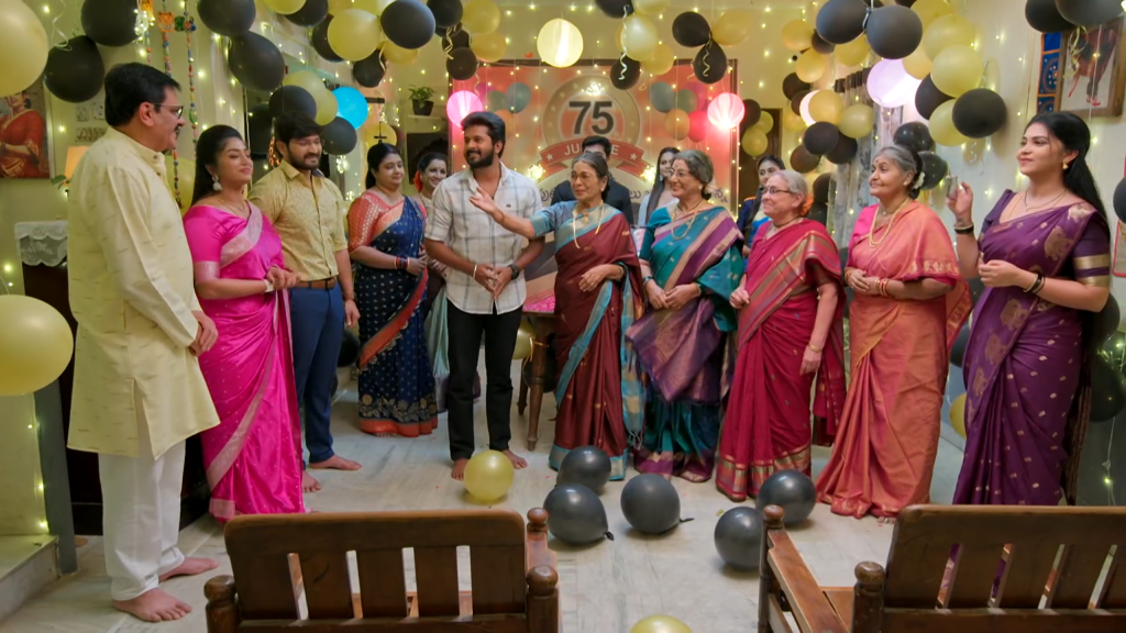 మనోజ్ ముందుగా వచ్చి పగడాల హారాన్ని బామ్మకు అందిస్తాడు. “ఇది నా గిఫ్ట్” అని చెప్తాడు. బామ్మ దానికి ఆచం అలాంటిదే పోయింది నది అనడంతో కామాక్షి ఇది కూడా నువ్వే మింగేసావా అని సెటైర్ వేస్తుంది మనోజ్ మీద. ఆ తర్వాత రవి ముందుకు వచ్చి, “నేను మీ కోసం స్పెషల్గా ఈ కేక్ తయారు చేశాను, తర్వాత నా బేకరీలో ఈ కేక్ను ప్రారంభించబోతున్నాను” అని చెప్తాడు. బామ్మ చిరునవ్వుతో చూస్తుంది.