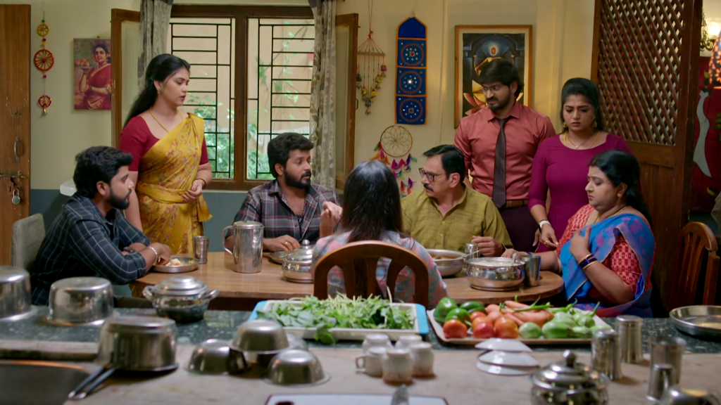 ఇక ఇంతలో ప్రభావతి, బాలూ, సత్యం, రవి, శృతి — అందరూ కలిసి భోజనం చేస్తుంటారు. మీనా వారికి వడ్డిస్తూ ఉంటుంది. బాలు ఇంకా ఇతర కుటుంబ సభ్యులు ప్రభావతి వంట గురించి సరదాగా కామెంట్ చేస్తూ నవ్వుతూ ఉంటారు.అదే సమయంలో రోహిణీ తన ఆనందాన్ని దాచుకోలేక, అక్కడే అందరి ముందూ పొగడ్తలు మొదలుపెడుతుంది. “మనోజ్ ని మీరు అంత కలిసి ఎపుడు ఎందుకు పనికిరాని వాడు అని సంపాదించడం చేత కాదు అని, గుడి దగ్గర అడుక్కునేవాడు అని , పార్కులో నిద్రపోయేవాడు అని అనేవారు కదా కానీ ఇపుడు అదే మనోజ్ తన తెలివితేటలతో నాలుగు లక్షలతో బిజినెస్ చేసి ఒక లక్ష లాభం తెచ్చాడు” అని చెబుతుంది. బాలూ తన సరదా శైలిలో “పార్లర్ దగ్గర పల్లీలు తినేవాడన్న మాట కూడా చెప్పు మరి!” అని వ్యంగ్యంగా అంటాడు — అందరూ నవ్వుల్లో మునిగిపోతారు.
