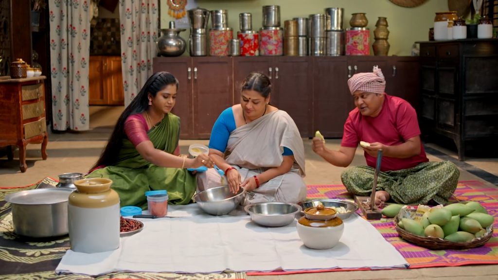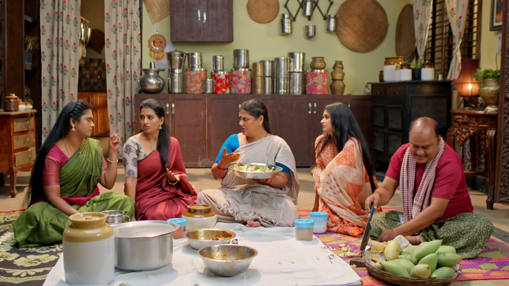 రాత్రి భోజన సమయం అవుతుంది. ఇంట్లో అందరూ కూర్చుంటారు. భాగ్యం చేతిలో ఆవకాయ జాడీ పట్టుకుని వస్తుంది. ఆవకాయ వడ్డిస్తూ “మా పచ్చడి రుచి ఒకసారి చూసి చెప్పండి” అని రామరాజును అడుగుతుంది.
