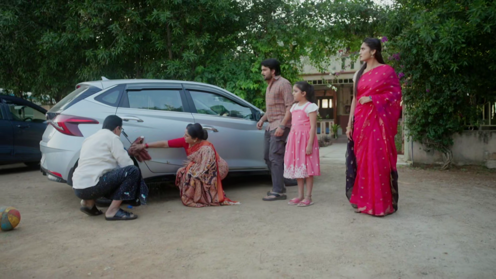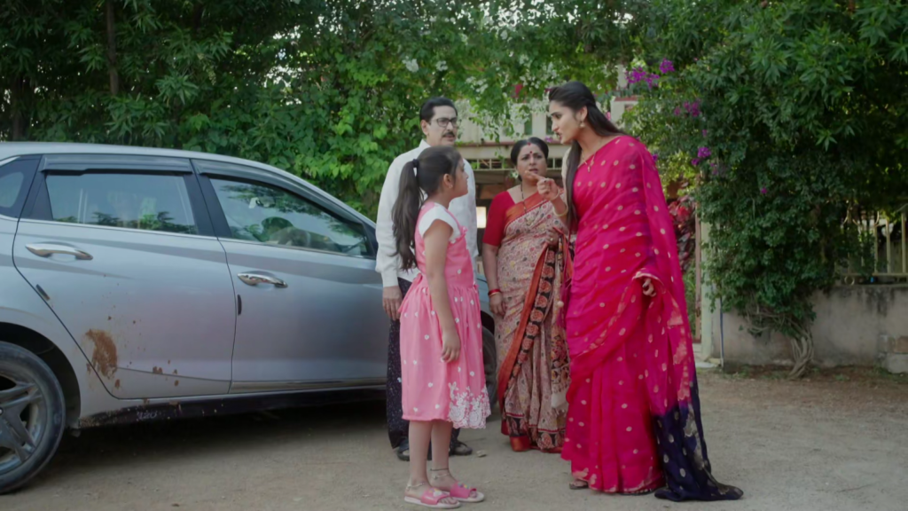 అపుడే అటుగా వచ్చిన అత్తమామలు శ్రియని ఆపుతారు. శ్రీయని మందలిస్తూ “చిన్నపిల్ల ఏదో తెలియక చేస్తే కొడుతున్నావా?” అని అంటారు. శ్రియ మొండిగా “పిల్ల అయితే పాపం ఏంటి? బురద వేసింది. ఇలానే వదిలేస్తే ఎలా తయారవుతుందో అందుకే బుద్ధి చెప్తున్నా” అని అంటూ ఆరాధ్యని కార్ క్లీన్ చేయమని చెప్తుంది. అది విని పార్వతి, రాజేంద్ర ప్రసాద్ లకి కోపం వస్తుంది.