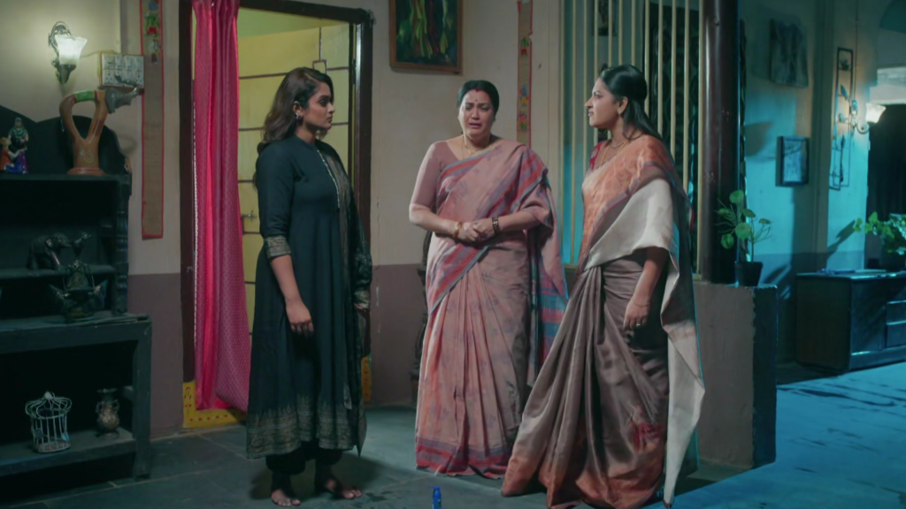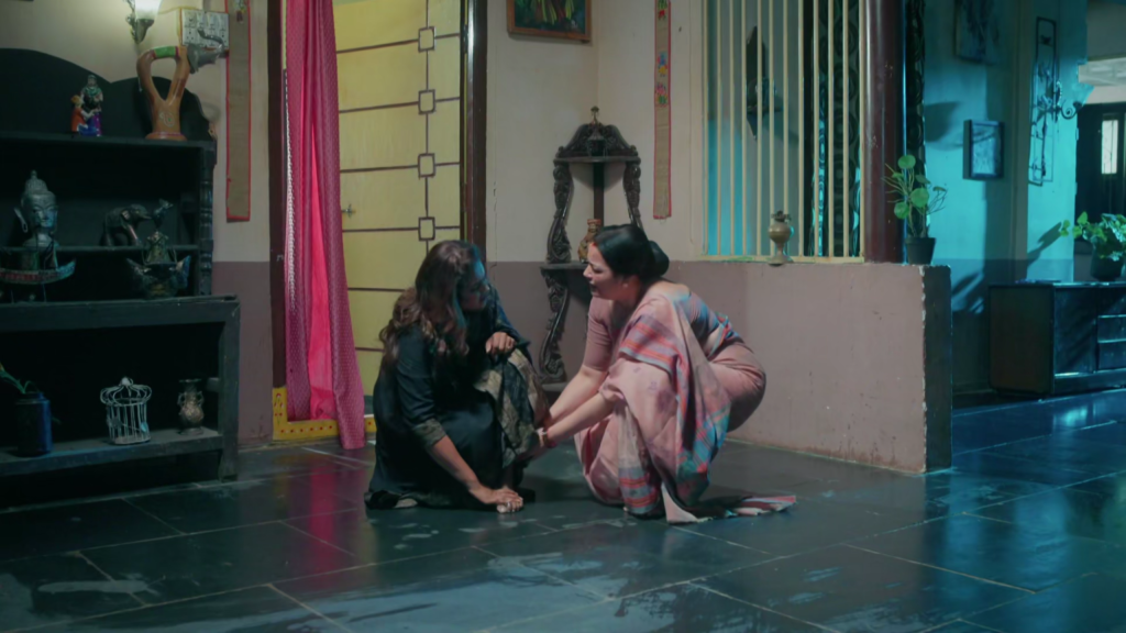 పల్లవి ఆకలి, అవమానం, కోపంతో రూమ్ నుంచి బయటకు వస్తూ గడపపై జారి కిందపడిపోతుంది. నొప్పితో “అమ్మ!” అంటూ అరవగానే మీనాక్షి పరుగెత్తుకుంటూ వచ్చి, తల్లి ప్రేమతో ఆమె కాలి దగ్గర కూర్చుని “ఏమైందమ్మా? నొప్పిగా ఉందా?” అని అడుగుతూ వెంటనే నూనె తీసుకుని మృదువుగా మసాజ్ చేయడం మొదలుపెడుతుంది. పల్లవి సైలెంట్ గా ఉంటుంది.